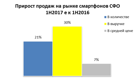 За 1 полугодие 2017 года на Сибирский рынок смартфонов в количественном выражении продемонстрировал рост на 21% относительно результатов продаж 1 полугодия 2016 года. В денежном выражении рынок прирос на 30% и составил 18,2 млрд рублей. Средняя цена на устройства также показала положительный прирост в 7% и составила 10 700 рублей.