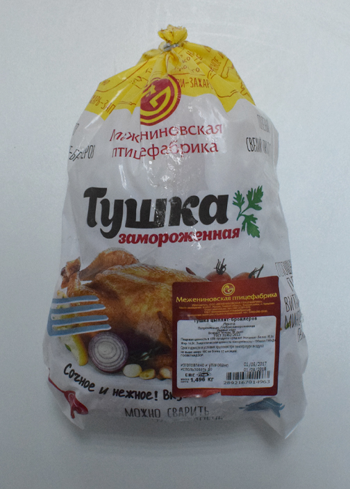 Характеристика товара: Тушка цыпленка-бройлера 1 сорта потрошеная глубоко-замороженная т\м «Межениновская птицефабрика»