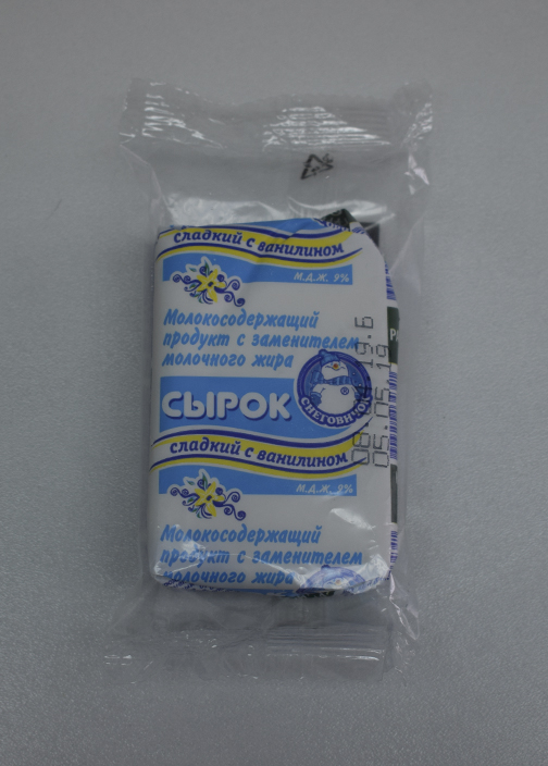 Характеристика товара: Молокосодержащий продукт с заменителем молочного жира, произведенный по технологии творога, сырок сладкий с ванилином м.д.ж 9,0 % т/м «Снеговичок»