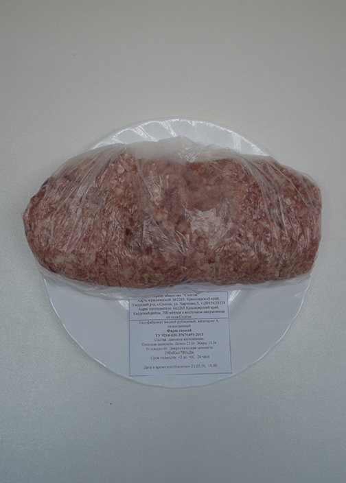Характеристика товара: Фарш свиной охлажденный. Полуфабрикат мясной рубленый, категории А т/м АО «Солгон»