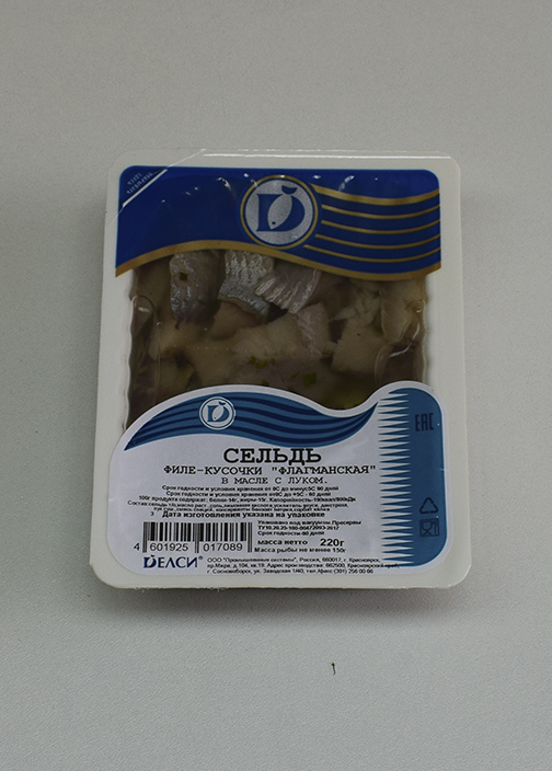 Характеристика товара: Пресервы рыбные. Сельдь филе-кусочки «Флагманская» в масле с луком т/м «Делси»