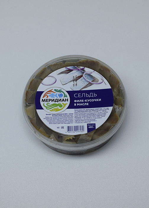 Пресервы. Сельдь тихоокеанская филе-кусочки без кожи в масле. Охлажденный продукт. т.м. «Меридиан»