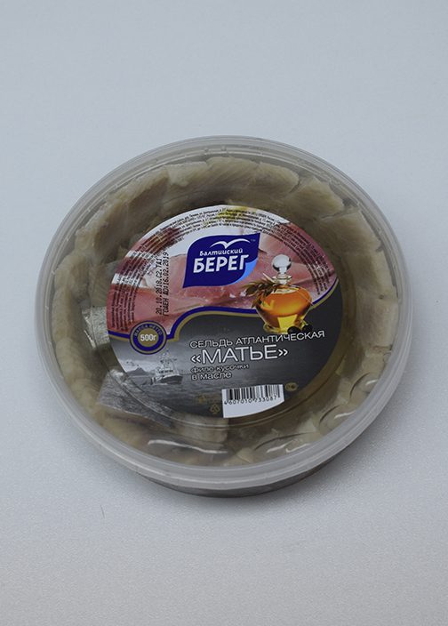 Пресервы рыбные. Сельдь атлантическая «Матье» филе-кусочки в масле т/м «Балтийский берег»