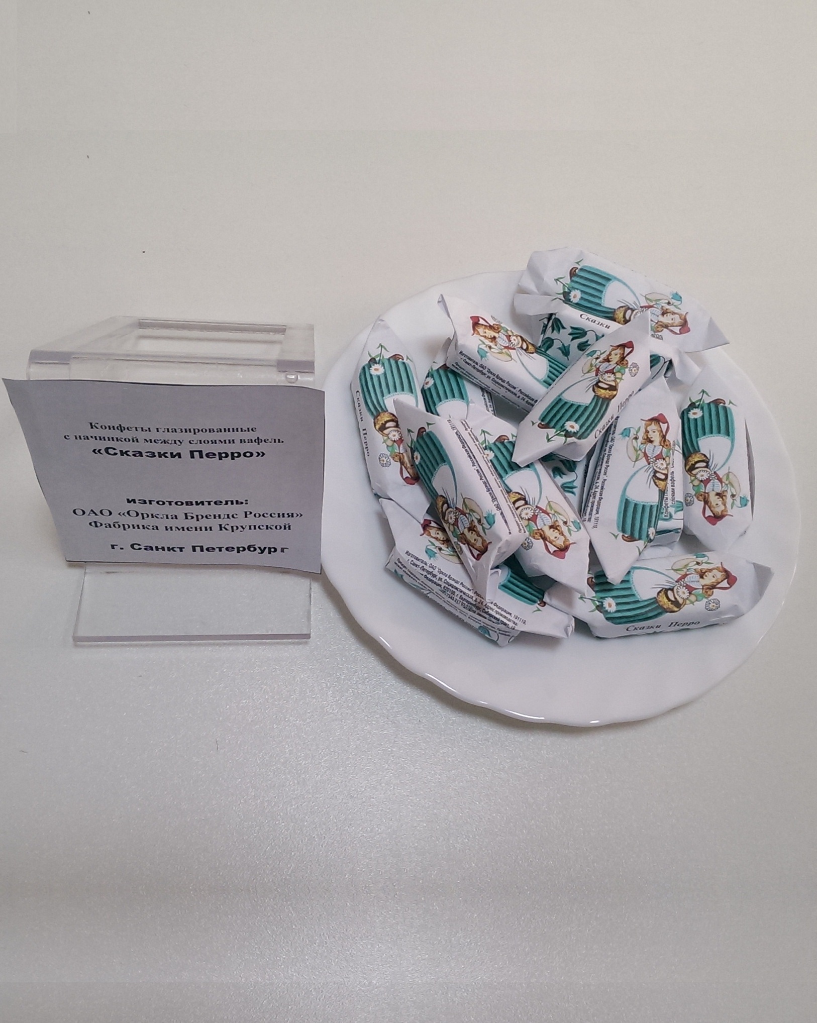 Конфеты глазированные с начинкой между слоями вафель «Сказки Перро» производства ОАО «Оркла Брендс Россия» «Фабрика имени Крупской» – при исследовании продукции по микробиологическим показателям (д.в. 25.06.2014г.) нарушений не установлено, продукция соответствует требованиям нормативно-правового акта и нормативного документа (протокол испытаний № 12723 АИЦ ФБУ «Красноярский ЦСМ» от 25.11.2014г.). При органолептической оценке установлено, что у продукции (д.в. 25.06.2014г.) форма – прямоугольная, ровная. Вкус и запах характерные для данного вида продукции, с ясно выраженным вкусом ароматических и вкусовых добавок. Поверхность конфет- сухая, глазурь блестящая, имеется наличие единичных раковин. Цвет однородный коричневый. Консистенция твердая, мягкая при раскусывании. По маркировке потребительской тары продукция соответствует требованиям нормативной документации.