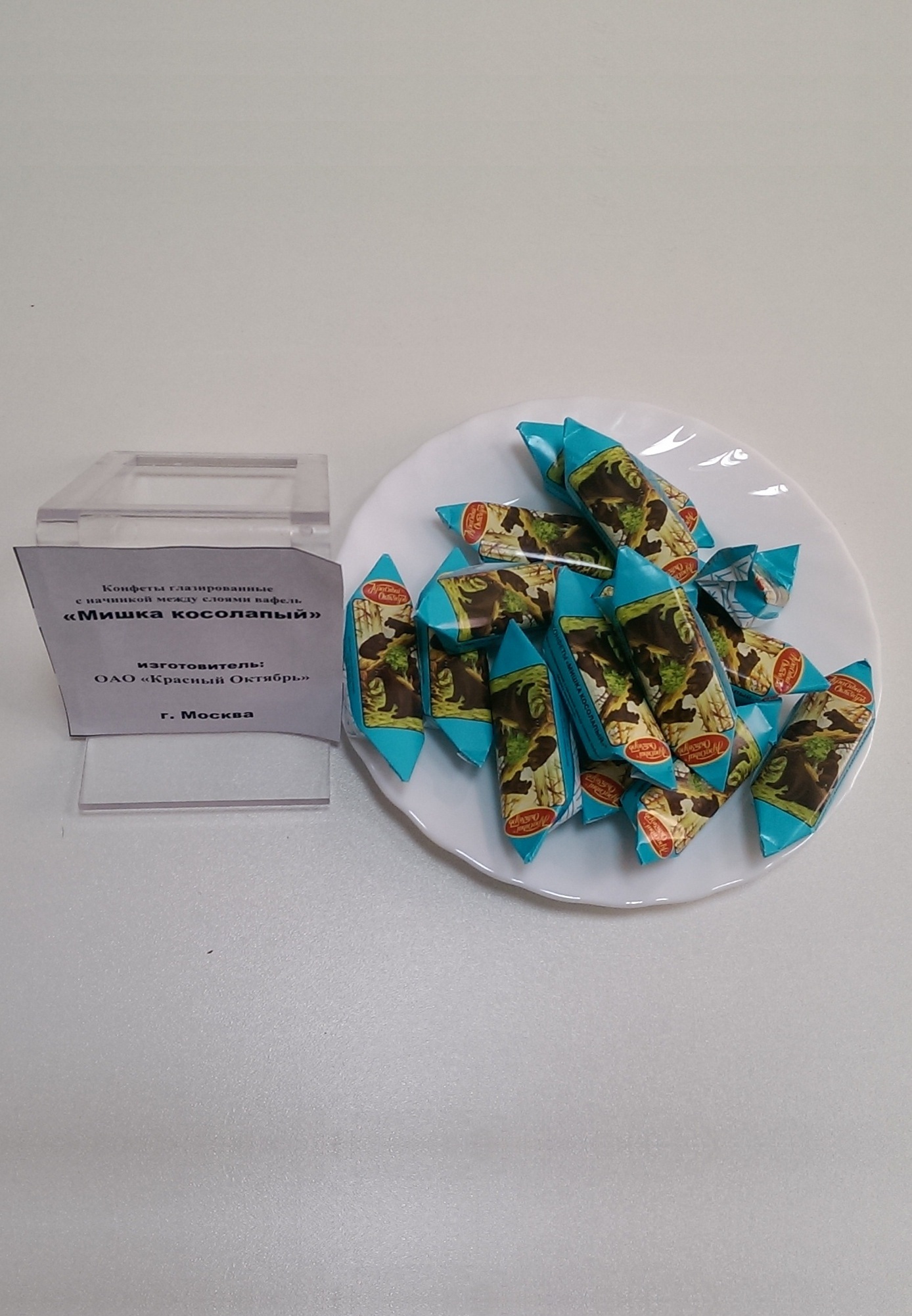 Конфеты глазированные с начинкой между слоями вафель «Мишка косолапый» производства ОАО «Красный Октябрь» – при исследовании продукции по микробиологическим показателям (д.в. 15.05.2014г.) нарушений не установлено, продукция соответствует требованиям нормативно-правового акта и нормативного документа (протокол испытаний № 12721 АИЦ ФБУ «Красноярский ЦСМ» от 25.11.2014г.). При органолептической оценке установлено, что у продукции (д.в. 15.05.2014г.) форма – прямоугольная, ровная. Вкус и запах характерные для данного вида продукции, с ясно выраженным вкусом ароматических и вкусовых добавок. Поверхность конфет - сухая, глазурь блестящая. Цвет однородный коричневый. Консистенция твердая, мягкая при раскусывании. По маркировке потребительской тары продукция соответствует требованиям нормативной документации.