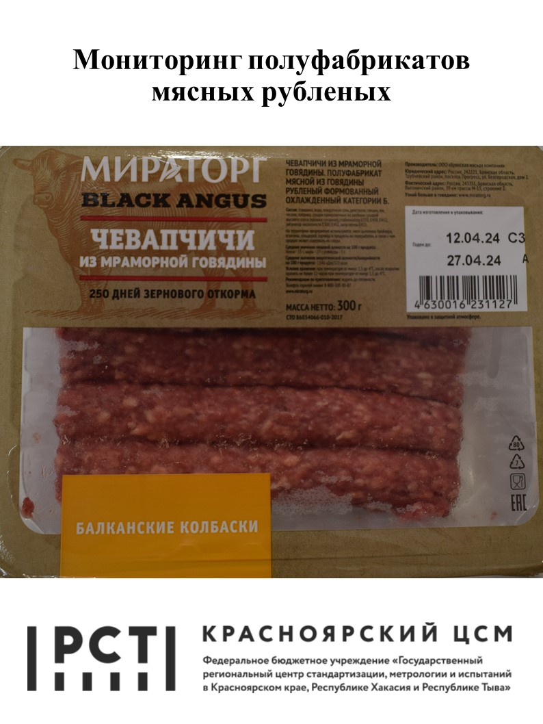 Мониторинг полуфабрикатов мясных рубленых проведен ФБУ «Красноярский ЦСМ» согласно письму Министерства сельского хозяйства Красноярского края (исх № 11-25/908 от 20.02.2024), заявкам, поступившим на сайт «Проднадзор. Инфо» и плану проведения мониторингов ФБУ «Красноярский ЦСМ» на 2 кв. 2024 года с целью оценки качества и безопасности пищевой продукции, реализуемой на территории Красноярского края. Для проведения мониторинга в торговых сетях г. Красноярска были приобретены 9 образцов полуфабрикатов мясных рубленых, изготовленных в Красноярском и Алтайском краях, Омской, Брянской и Томской областях, Республике Татарстан. На момент приобретения образцов продукции в торговых сетях нарушений условий хранения не установлено. Продукция после приобретения ее в торговых сетях была уложена в сумку - холодильник и доставлена в ФБУ «Красноярский ЦСМ». После доставки продукции в ЦСМ она была направлена для испытаний. В ходе проведения мониторинга продукция исследовалась в аккредитованном испытательном центре (ИЦ) ФБУ «Красноярский ЦСМ» по микробиологическим показателям. Кроме того, продукция в ходе проведения мониторинга была проанализирована по маркировке потребительских упаковок в части указания информации о наименовании продукта, предприятии-изготовителе, дате изготовления и сроках годности, условиях хранения, составе и др. на соответствие требованиям ТР ТС 022/2011 «Пищевая продукция в части ее маркировки», ТР ТС 034/2013 «О безопасности мяса и мясной продукции», ТР ЕАЭС 051/2021 «О безопасности мяса птицы и продукции его переработки».