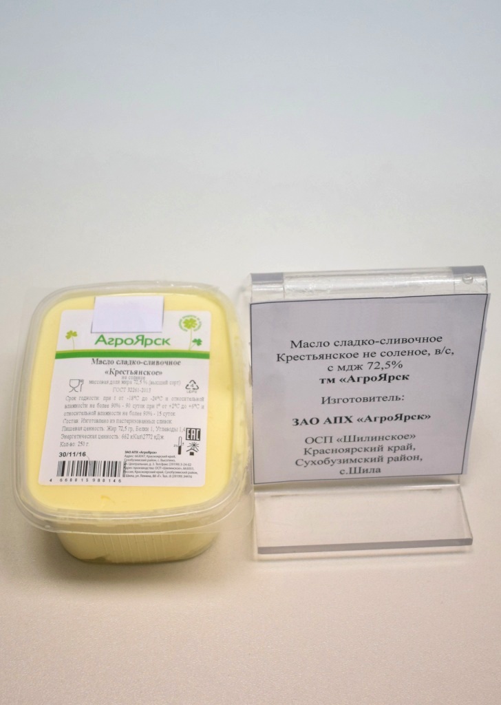 Масло сладко-сливочное Крестьянское с мдж 72,5% т/м «АгроЯрск» изготовлено из пастеризованных сливок