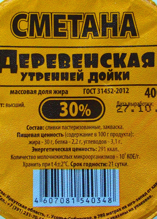 Описание товара:Сметана «Деревенская утренней дойки» м.д.ж. 30 %, сорт высший